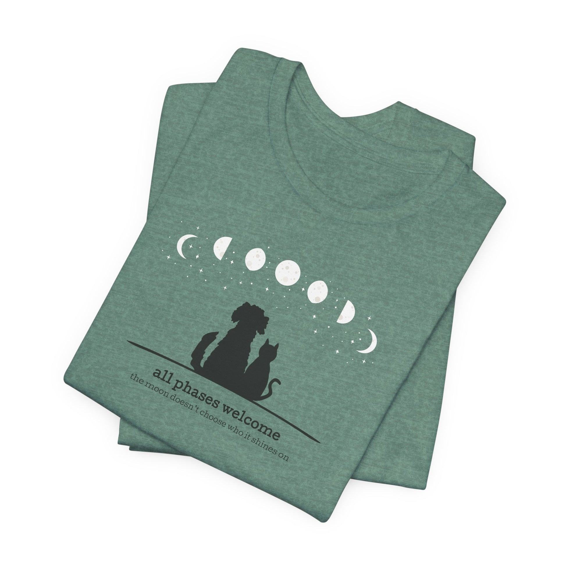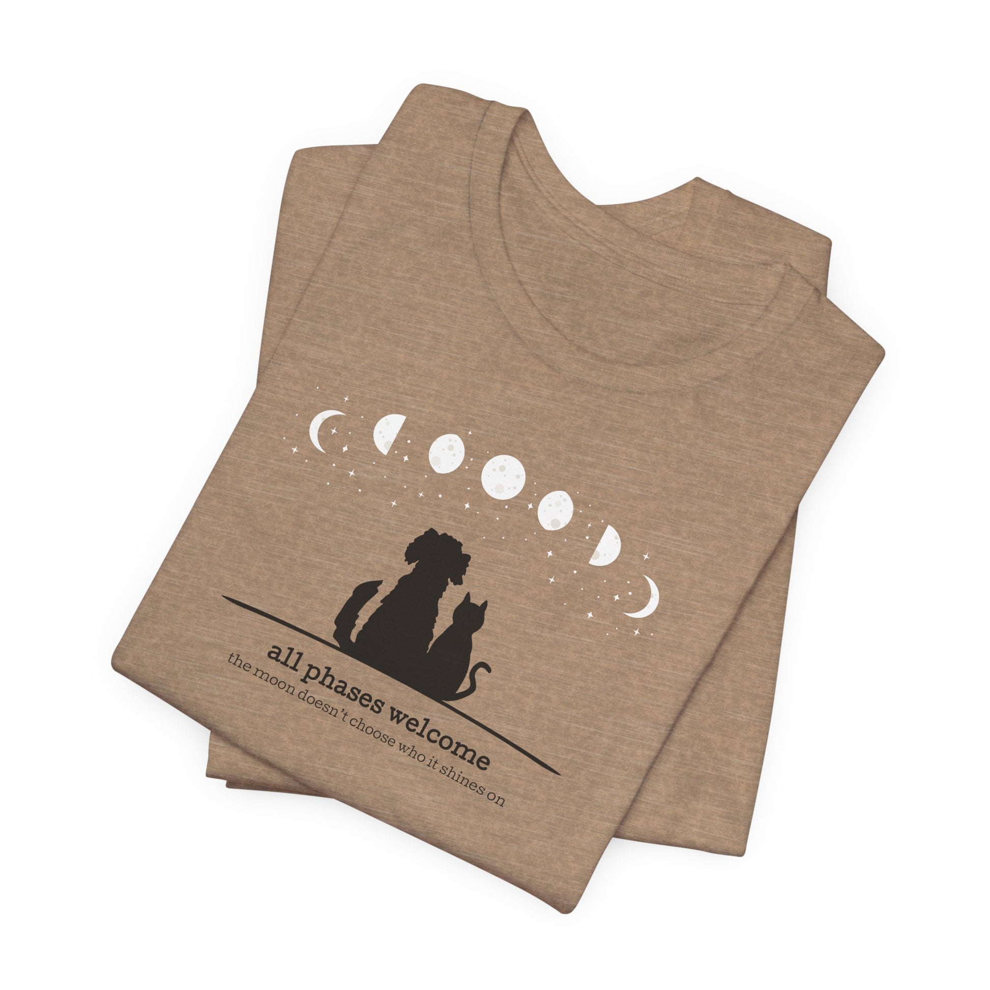Featuring a serene silhouette of a dog and cat gazing up at the moon and stars — with moon phases arching above — this soft, artist-made design reminds us that the moon doesn’t choose who it shines on.